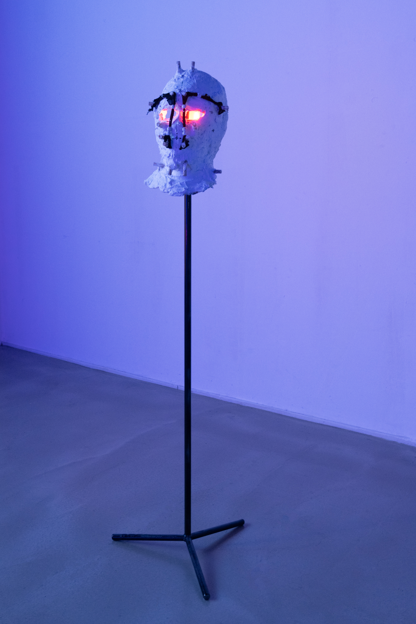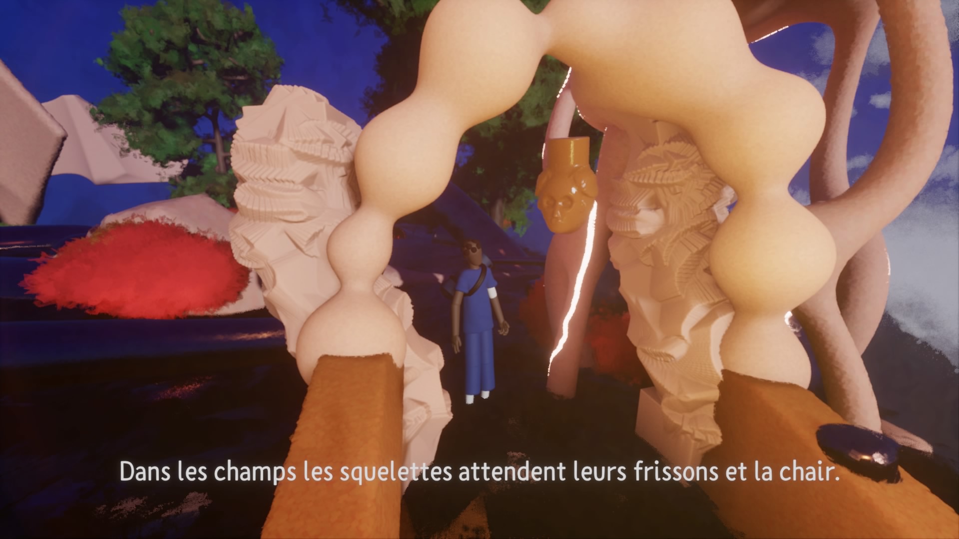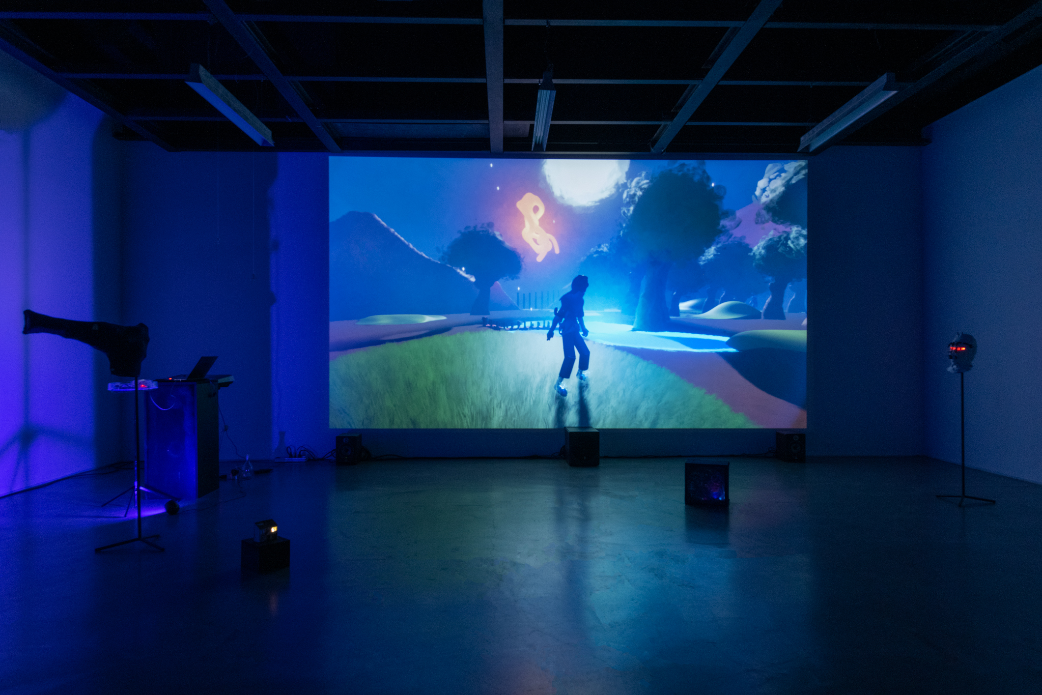 In the video game at the core of the project, the player takes on the role of a marron (a term used in slavery context to describe a slave who has run away from his master’s plantation). The performance takes the form of an immersive video game screening inside a sculptural installation. The sculptures are items, masks of some NPCs present in the game. The screening is accompanied a musical performance played on synths, controllers and Infra-red theremin.